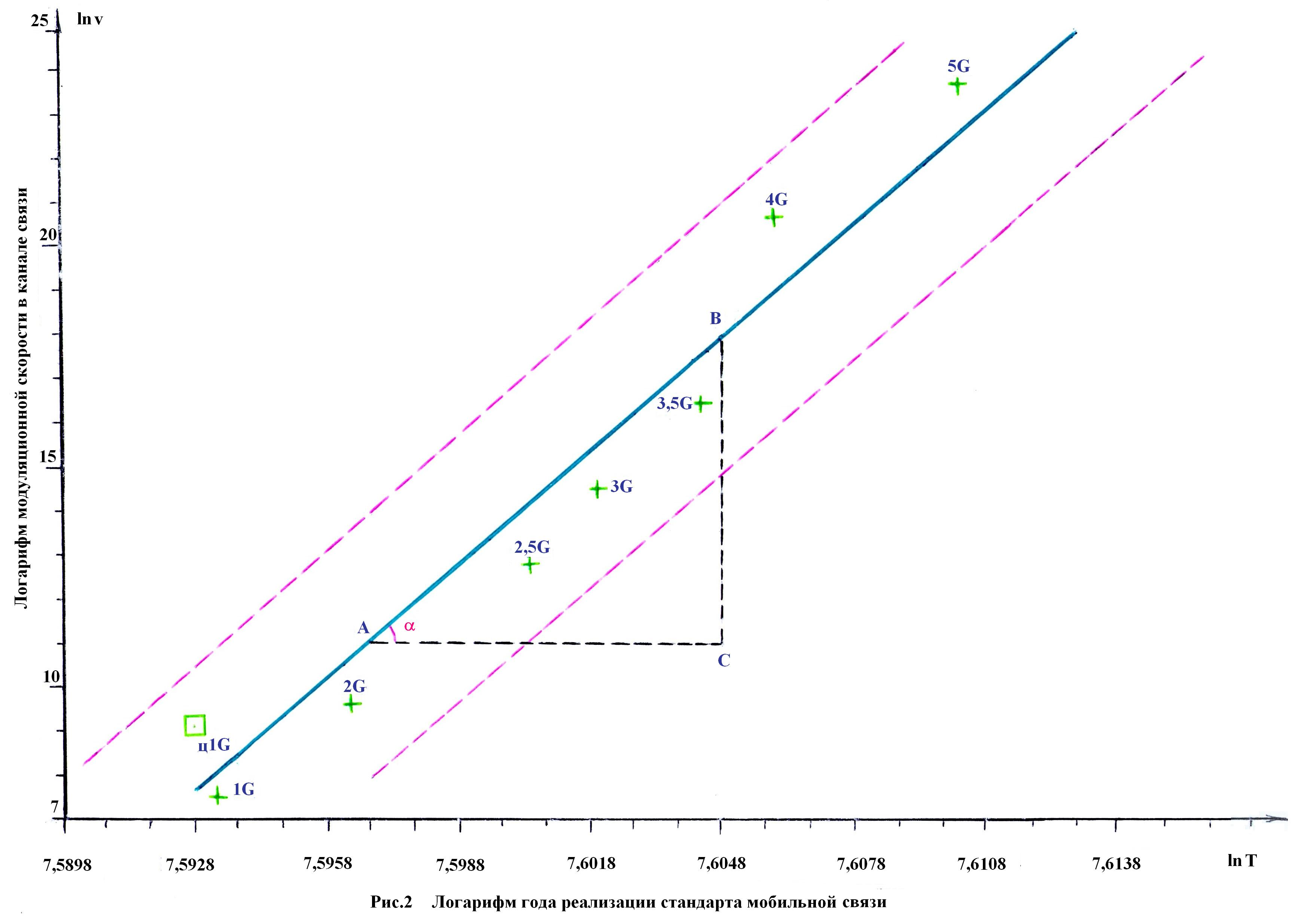 На рис.1 изображена зависимость натурального логарифма модуляционной скорости передачи цифрового сигнала либо, другими словами, полосы пропускания канала связи от времени (года реализации стандарта связи).