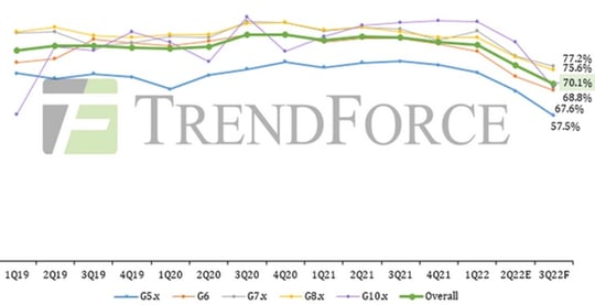 Даже в ковидном 2020-г. доля загрузки этих заказами производственных мощностей оставалась довольно высокой, превышая в среднем 80%, а по отдельным направлениям (Gen10.x, например) доходя и до 100%, напоминает ITBestsellers. Начиная же со II кв. текущего года эта доля стремительно снижается, а по итогам III кв. в TrendForce ожидают её сокращения сразу на целых 7,3% квартал к кварталу — до 70,1%.