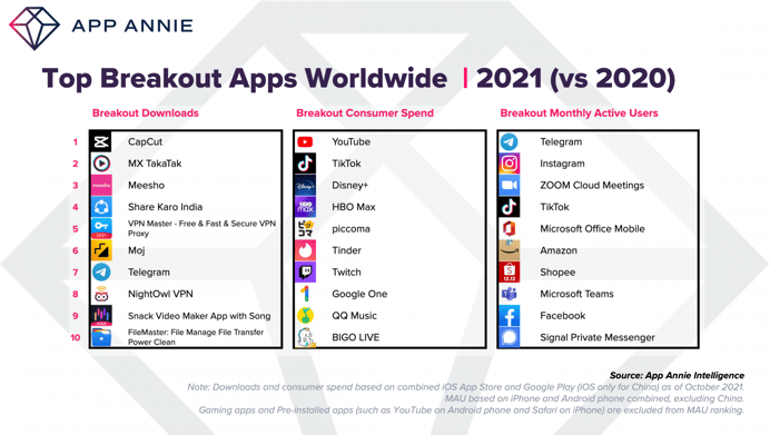 Среди приложений первое место по числу скачиваний за 2021 год занял видеоредактор CapCut. В десятку самых частых загрузок входит Telegram. Он же занял первое место по числу ежемесячно активных пользователей. Пользователи проявляли активность также в Instagram, Zoom и TikTok.