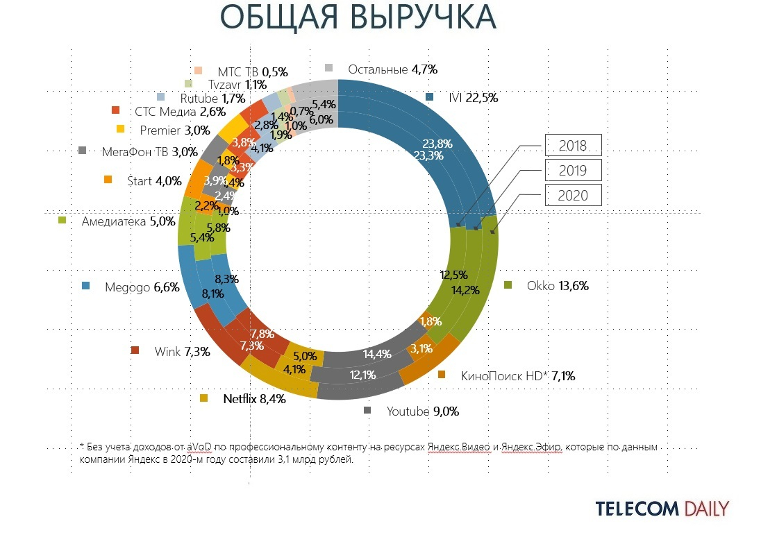 Российский рынок легальных видеосервисов по итогам 2020 года вырос на 50,4% и составил 62 млрд руб. Несмотря на то, что YouTube снизил свою долю на рынке, он впервые разделил первое …
