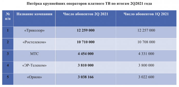 Топ-5 крупнейших операторов платного ТВ остался прежем: лидирует «Триколор» с 12,25 млн пользователей, «Ростелеком» — 10,71 млн, МТС — 4,45 млн, «ЭР-Телеком» — 3,81 млн, и «Орион» с 3,03 млн пользователей.