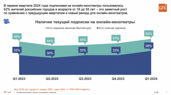 В первом квартале 2024 года 52% жителей российских городов пользовались подписками на онлайн-кинотеатры. Показатель вырос по сравнению с прошлым кварталом (47%) и установил новый рекорд для онлайн-кинотеатров. Предыдущий максимум по проникновению подписок в 49% был зафиксирован в первом квартале 2023 года. Такие данные приводят аналитики международной исследовательской компании GfK (результаты исследования есть в распоряжении Sostav).