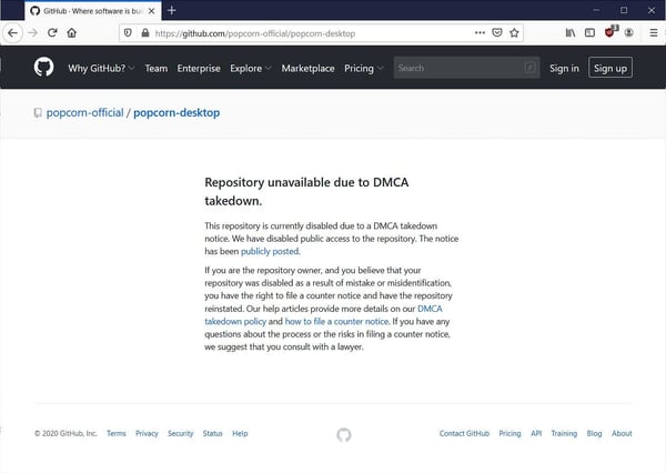 MPAA 1 мая 2020 г. потребовала от Github заблокировать репозитории popcorn-desktop и popcorn-api, в которых хранились исходные коды приложения Popcorn Time для настольных ПК и API (прикладного интерфейса программирования), направив претензию о нарушении проектом Закона об авторском праве в цифровую эпоху или DMCA (Digital Millennium Copyright Act). Этот акт дополняет законодательство США в области авторского права директивами, учитывающими современные технические достижения в области копирования и распространения информации.