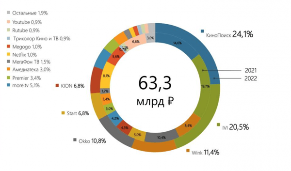 Согласно данным исследования TelecomDaily, по итогам 2022 года изменилось положение игроков на российском рынке видеосервисов. Бессменный в течение последних лет лидер — Ivi — уступил «Кинопоиску» (принадлежит «Яндексу»).