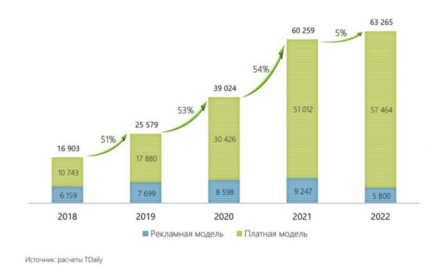 Как поясняют в TelecomDaily, вместе с этим на рынке ещё больше укрепила позиции платная модель (в основном — оплата подписки), вытесняя рекламную — бесплатный просмотр при условии обязательной рекламы. «По итогам 2021 года рекламная модель всё ещё приносила 15% выручки, в 2022-м её доля сократилась до 9%», — отмечают в компании, сравнивая показатели с 2018 годом, когда рекламная модель приносила 36% выручки — в четыре раза больше, чем в 2022 году.