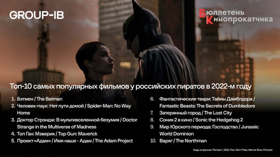 Group-IB, первая частная компания, специализирующаяся на исследовании высокотехнологичной преступности и защите от кибератак, определила ТОП-10 самых популярных фильмов у интернет-пиратов в уходящем году. Рейтинг возглавила картина «Бэтмен» режиссера Мэтта Ривза.