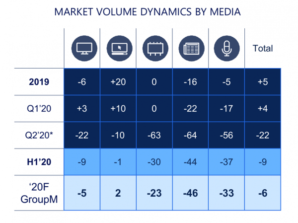 В июне 2020 года специалисты GroupM считали, что падение рекламного рынка относительно 2019 года составит 9%. Однако как пояснила генеральный директор GroupM в России и СНГ Мария Колосова, в компании решили изменить прогноз, так как считают, что рынок продолжит восстановление.