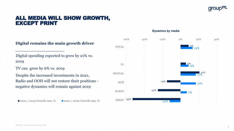 Ранее GroupM прогнозировала рост рекламного рынка на 12,3%. Эксперты подняли свою предыдущую оценку — она составляла 8,2%. Это стало возможно благодаря устойчивости digital-рекламы к пандемии.