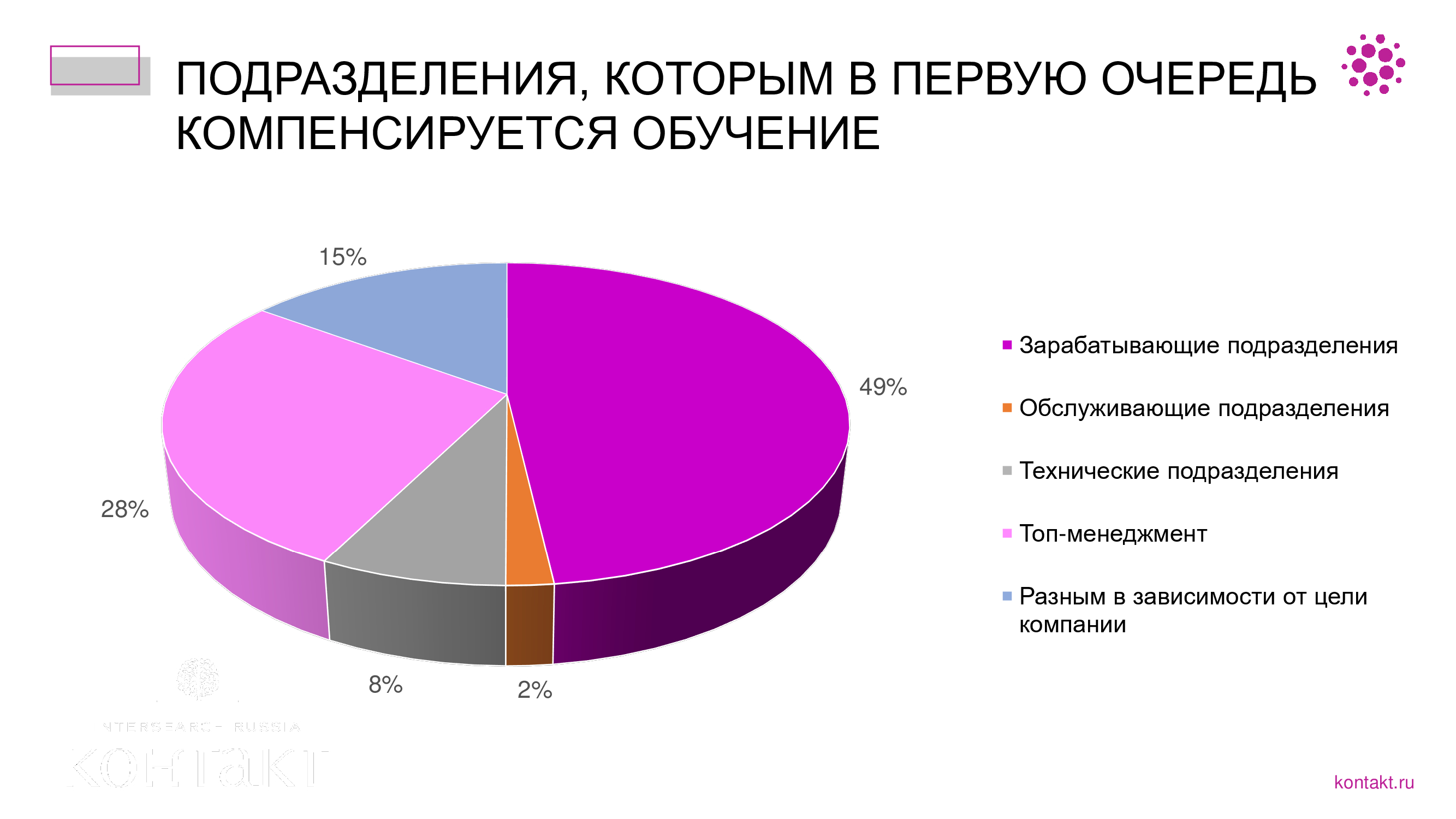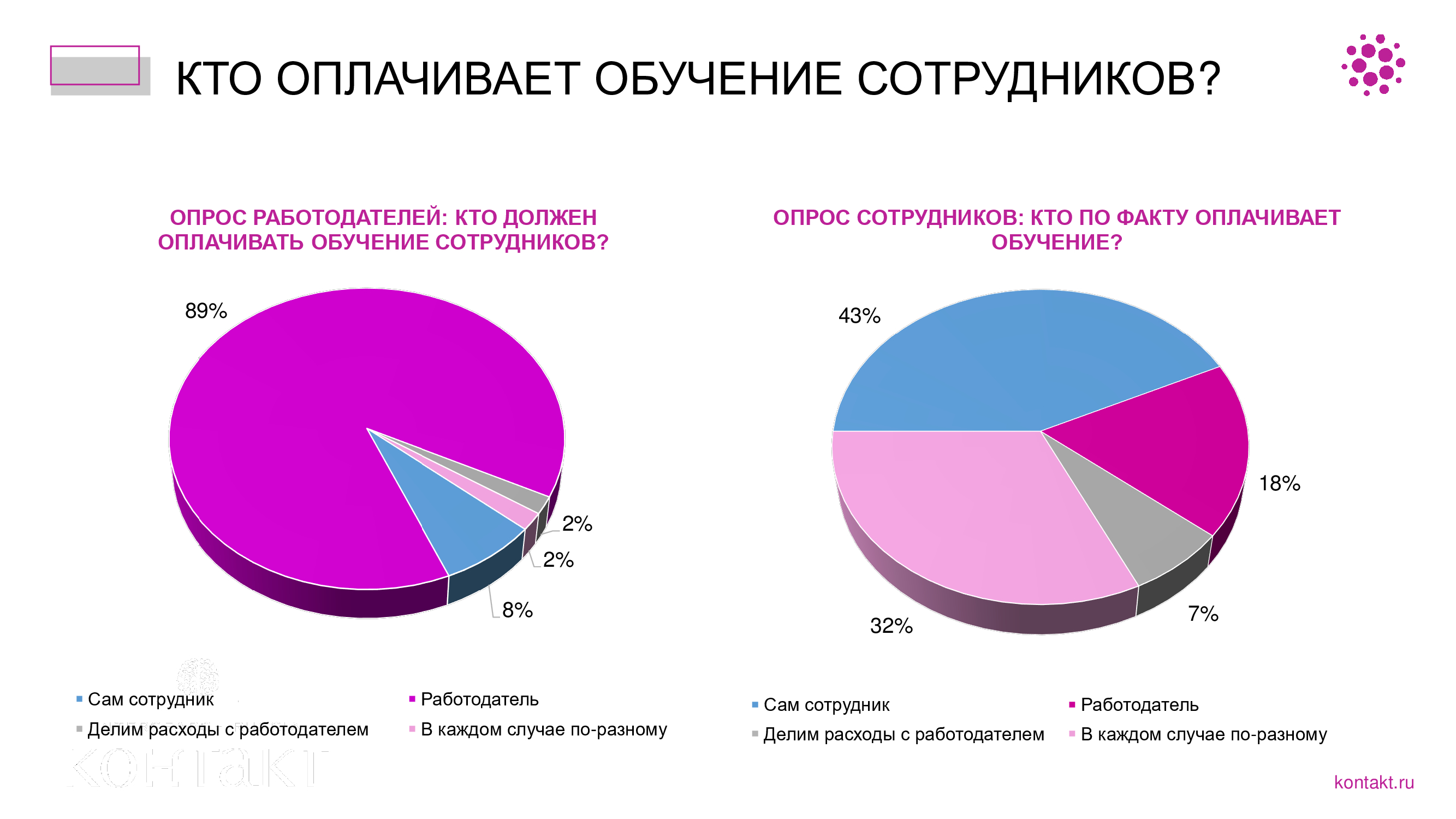 Компании готовы оплачивать обучение в первую очередь зарабатывающим подразделениям (49%), на втором месте по приоритетам – топ-менеджмент (28%). По мнению работодателей, именно компания должна оплачивать обучение сотрудников (89% ответов). Однако опрос работников свидетельствует о другой ситуации по факту: только 18% компаний полностью берут на себя расходы, в 43% случаев сотрудник-руководитель платит за образование сам.
