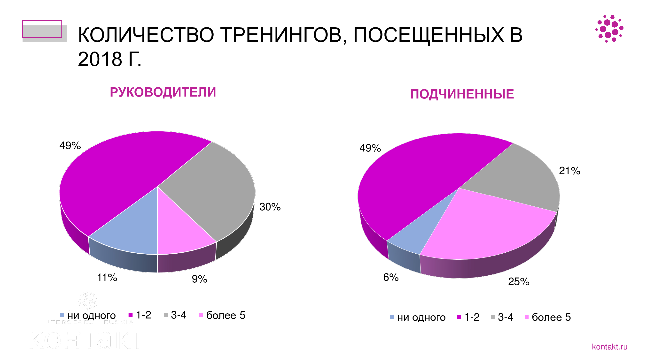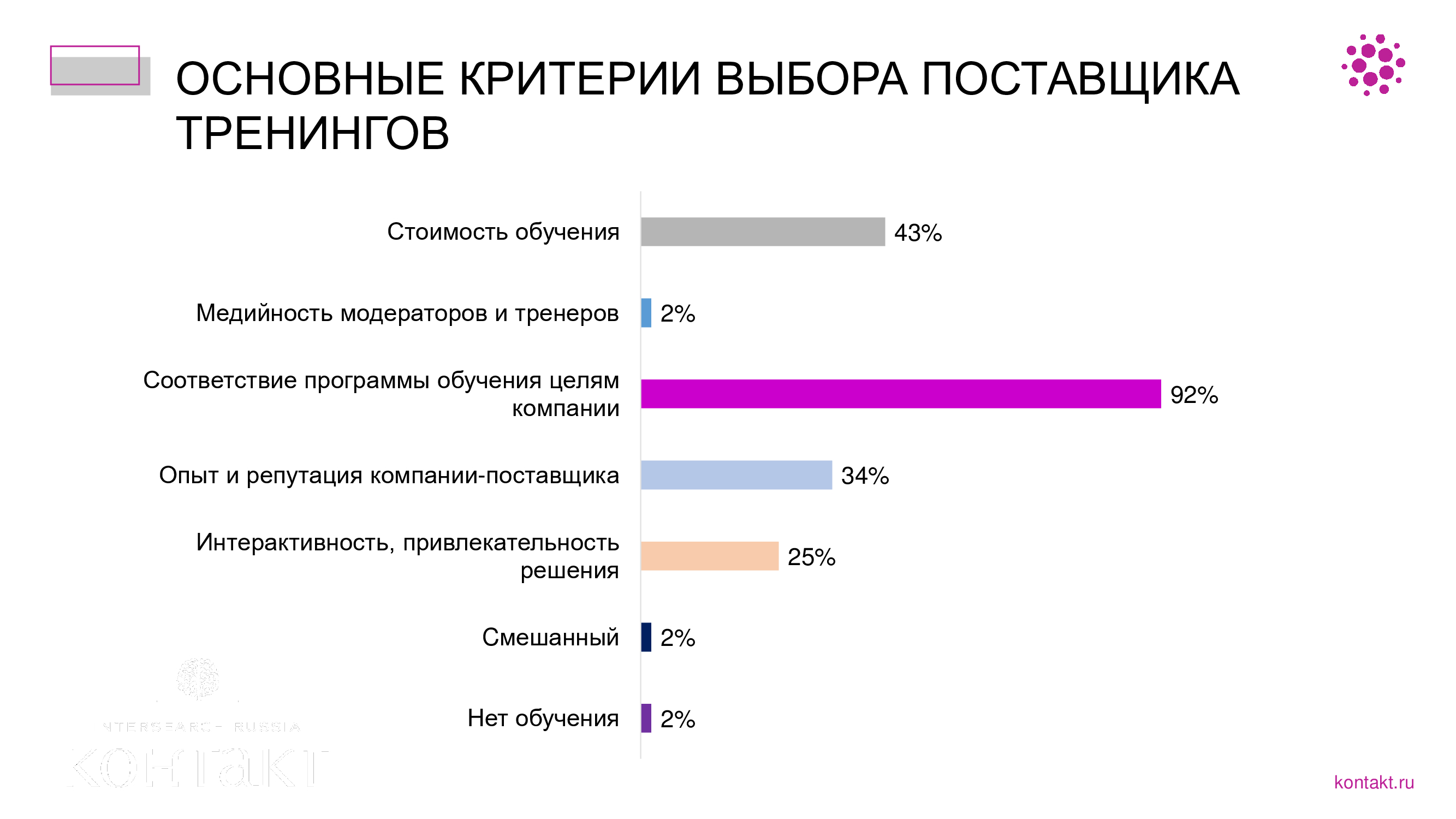 Как показали результаты исследования, только 6% работодателей никак не участвуют в обучении сотрудников. Большинство компаний выбирают поставщика тренингов, опираясь на соответствие программы целям обучения, стоимость и репутацию провайдера. Медийность тренера считается наименее ценным фактором.