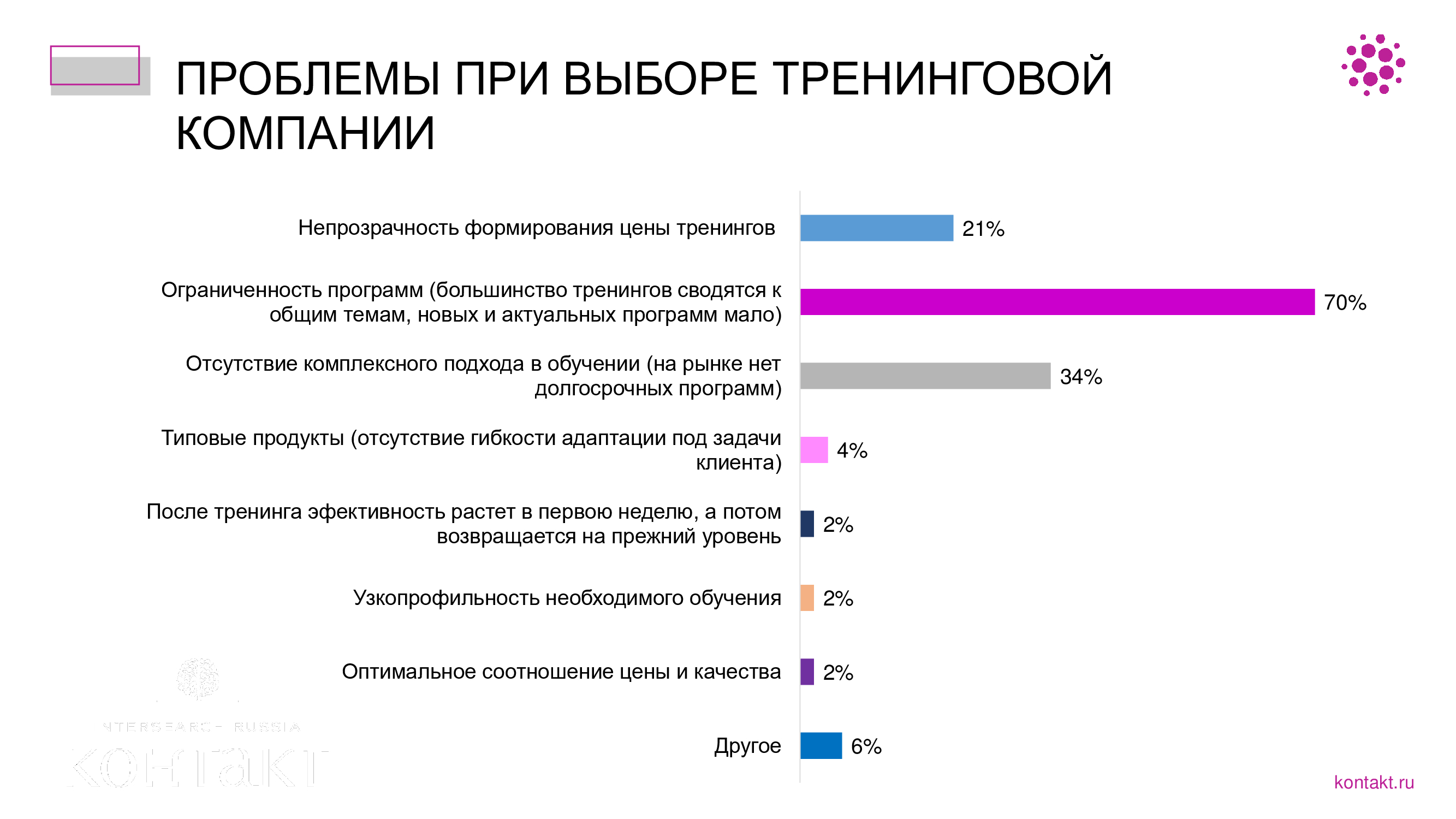 По мнению респондентов, ключевая проблема выбора тренинговой компании – ограниченный список программ: большинство курсов сводится к общим темам, новых и актуальных вариантов появляется крайне мало.