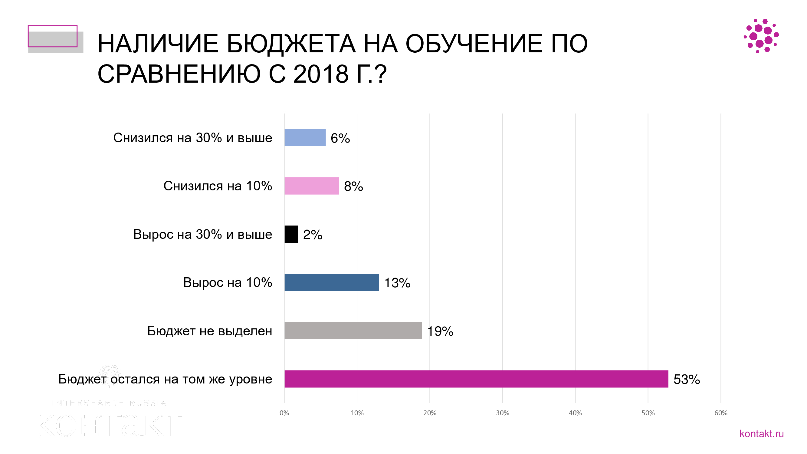 Более половины компаний решили не сокращать бюджет на образование персонала в 2019 году. При этом 15% работодателей увеличили, а 14% компаний – напротив, уменьшили затраты на обучение по сравнению с предыдущим годом. У 19% работодателей бюджет на образовательные программы для сотрудников не выделен.