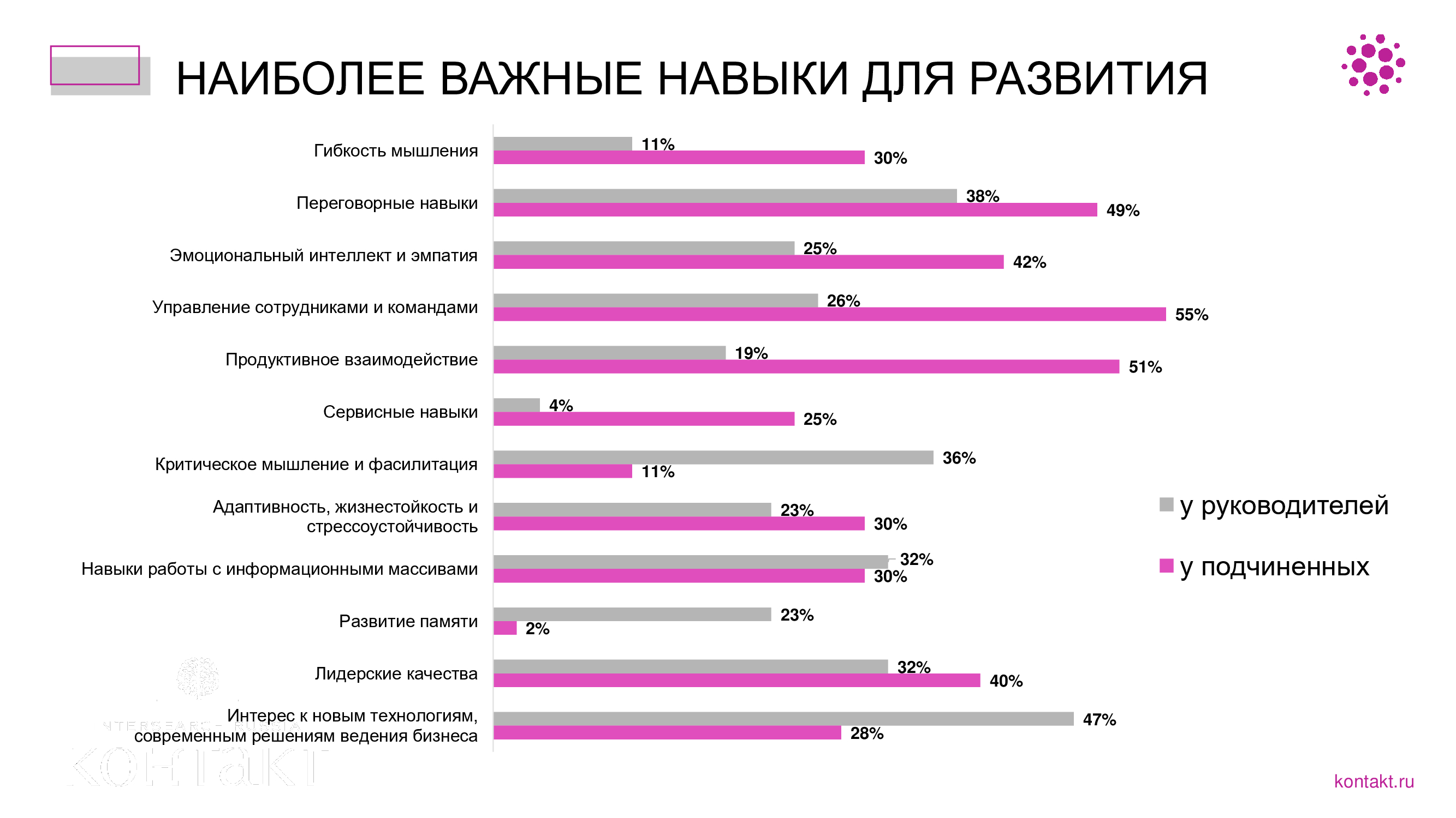 Наиболее важными навыками для развития у управленческой линейки респонденты назвали: интерес к новым технологиям и современным решениям ведения бизнеса (47%), переговорные навыки (38%), креативное мышление (36%). Подчиненным же следует учиться управлению командой (55%), продуктивному взаимодействию (51%) и также переговорным навыкам (49%).