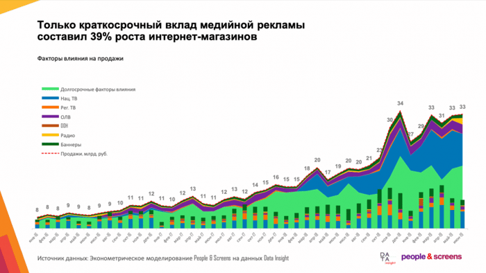 Агентство People&Screens (входит в Dentsu Aegis Network) совместно с Data Insight провели исследование влияния медийной рекламы на онлайн-продажи. Как выяснилось, медийная реклама увеличивает конверсию по всей воронке продаж, развивая бренд онлайн-магазина. Вместе с тем, эффективность каждого медиа зависит от категорий товаров.