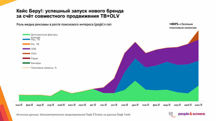 Маркетплейс «Беру!» был запущен в 2018 году. На диаграмме показано, как менялся поисковый интерес к новому бренду благодаря медиарекламе. Основной вклад внесла реклама на ТВ и OLV. В случае с «Беру!», поисковые запросы с высокой точностью описывают продажи компании (кроме января 2019 года).