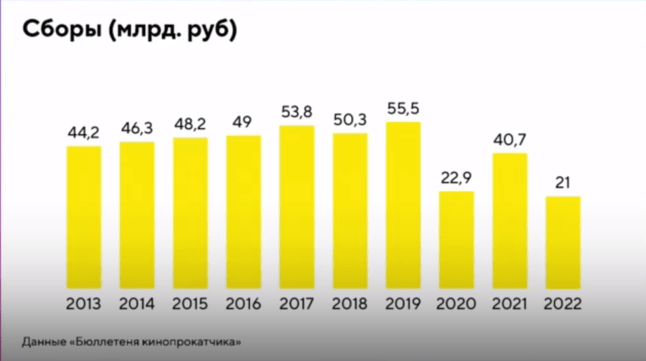 Кассовые сборы за 2022 год составили 21 млрд руб., что в два раза меньше показателей прошлого года. Ещё сильнее ощущается падение по количеству проданных билетов: в этом году всего было продано около 73 млн штук, тогда как в 2021-м — 147,5 млн штук. Такие данные «Фонда кино» и издания «Бюллетень кинопрокатчика» представил директор по киноканалам АО «Цифровое телевидение» (ВГТРК и Ростелеком) Иван Кудрявцев на форуме «Киноиндустрия в новой реальности».