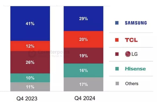 Важно подчеркнуть, что в классификации Counterpoint к «премиальным» ТВ относятся не устройства с определёнными экранными габаритами или рекомендованной розничной ценой, а как раз выделяющиеся из общего ряда передовыми технологиями экранных матриц: QD-MiniLED, QD-LCD, NanoCell, LCD 8K, QD-OLED, WOLED, MicroLED. Таких моделей, наиболее выгодных по причине своей высокой доходности и для производителей, и для канала, за IV кв. 2024 г. в мире было отгружено на 51% больше, чем за аналогичный период годом ранее, а за весь прошлый год — на 38% больше, чем в 2023-м.