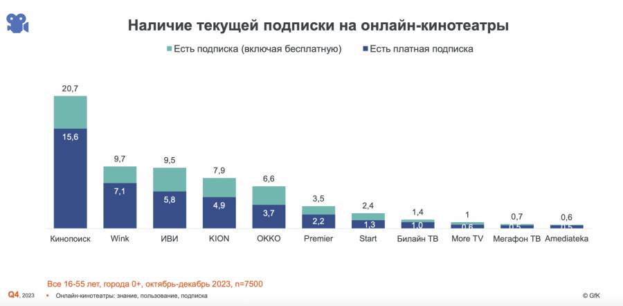Также в исследовании GfK говорится, что самая высокая доля женщин среди платящих подписчиков у «Иви» — 56%, мужчин — у Wink (53%). Единственный кинотеатр из первой пятёрки с равными долями мужчин и женщин — «Кинопоиск».