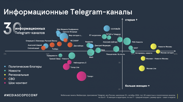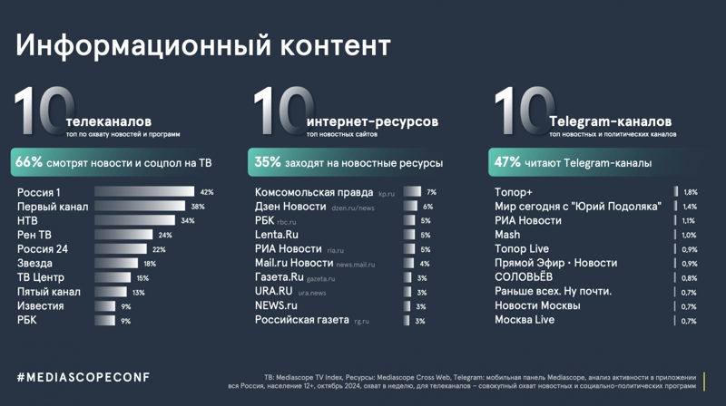 Согласно данным Mediascope, 66% населения в возрасте старше 12 лет хотя бы раз в неделю смотрят новости и социально-политические передачи на ТВ, 47% читают новостные Telegram-каналы, 35% заходят на информационные ресурсы в интернете.
