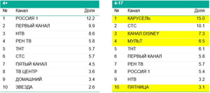 ТОП-3 канала по объему аудитории среди всех телезрителей в возрасте от 4-х лет в новогодние праздники не отличается от других дней в году. Лидерство в первой тройке принадлежит России 1, затем следуют Первый канал и НТВ. Состав ТОП-10 каналов по разным возрастным группам заметно отличается: помимо общих лидеров, в юной аудитории появляются детские каналы (Карусель, Disney, Мульт), у зрителей молодого и среднего возраста (18-44 лет) развлекательные каналы Пятница и ТВ-3, а в самой старшей аудитории (45+) – Россия 24.