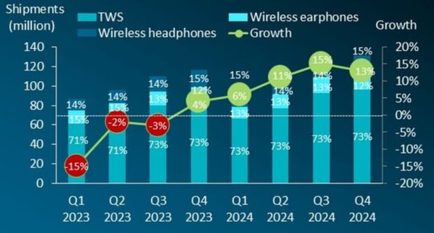 Рассматривая отдельные бренды персонального умного аудио, эксперты относят их к одной из трёх групп: давно зарекомендовавшие себя независимые игроки в этом сегменте (Sony, Sennheiser, Bose и т. д.), платформенные поставщики (наушники под марками Apple, Samsung, Huawei и т. д.) и активные новые игроки (Deer, Sanag, Soundcore и т. д.) Как и следовало ожидать, наиболее острое соперничество разворачивается между двумя последними группами. Если на давно привычные аудиофилам бренды с историей приходится 21% поставок в сегменте умного персонального аудио, и рост за прошлый год они показали всего лишь в районе 1%, то платформенные поставщики занимают 34% сегмента (и прирост их отгрузок — уже 16% год к году), а деятельные новички обеспечивают 45% поставок (+13% от уровня 2023 г.).