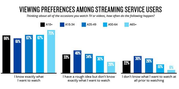 Согласно отчету Nielsen об общей аудитории по итогам 1 квартала 2019 года, 66% пользователей стриминговых сервисов «точно знают», что они хотят смотреть, когда подключены к платформам. Процент респондентов, выбирающих этот ответ, повышается с возрастом и достигает 75% в группе среди тех, кому 65 лет или больше.