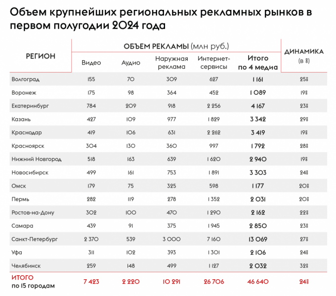 Региональный рекламный рынок также стабильно находится в положительной зоне. По итогам полугодия он вырос на 17%. Объем (без учета московского рынка) в средствах распространения рекламы по пяти сегментам (видео, аудио, издательский бизнес, наружная реклама и интернет-сервисы) превысил 58 млрд руб. При этом суммарные объемы рекламных бюджетов на 15 крупнейших региональных рынках (без учета Москвы), каждый из которых за первые два квартала 2024 года оказался более 1 млрд руб., увеличились на 24% год к году.