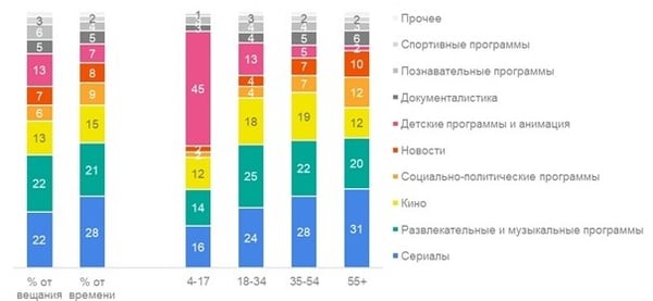 Спрос на жанры профессионального контента также зависит от возраста аудитории. Так, самые юные жители страны тратят на просмотр детских программ, мультипликационных сериалов и фильмов 45% всего времени, проведенного у телевизора. Среди молодежной аудитории наиболее востребованы развлекательные передачи и кинофильмы. С увеличением возраста зрителей растет спрос на сериалы, новости и социально-политические программы.
