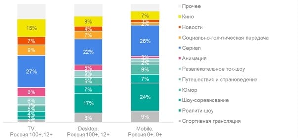 На контентные предпочтения зрителей также влияет тип экрана. На ноутбуках и компьютерах основная часть просмотра приходится на развлекательные форматы и сериалы. На смартфонах и планшетах больше, чем на других экранах, смотрят реалити-шоу и сериалы, преимущественно получасового формата.