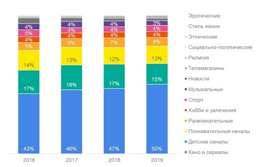 С точки зрения жанровых предпочтений зрителей в тематическом ТВ, как и на федеральных каналах, наблюдается относительная стабильность, за исключением сокращения доли аудитории новостных каналов в последние четыре года. Половину всего времени просмотра тематического ТВ зрители тратят на каналы, которые показывают кино и сериалы. Далее следуют детские и познавательные каналы. На четвертом месте по доле аудитории среди всего тематического ТВ - развлекательные каналы, а замыкают топ наиболее популярных жанров каналы, посвященные хобби и увлечениям, спорту и музыке.