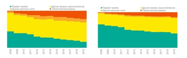 Увеличение числа каналов и способов просмотра телевизионного контента приводит к усиленной конкуренции между каналами и фрагментации зрительского внимания. Общий объем телепросмотра не увеличивается, а телезрители тратят меньше времени на каждый канал, чем пять или десять лет назад. Молодежь уже давно значительно сократила и продолжает сокращать просмотр "большой тройки" (Первый канал, Россия 1, НТВ). Среди старшего поколения доля этих каналов в большей степени перераспределялась между собой, при этом их общая аудитория с 2016 года оставалась стабильной. Ситуация изменилась в 2019-м, когда впервые за эти годы среди зрителей категории 45+ произошло перераспределение аудитории "большой тройки" в пользу других каналов, в том числе нишевых.