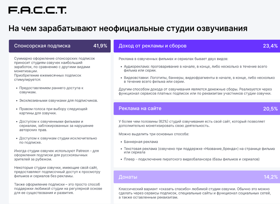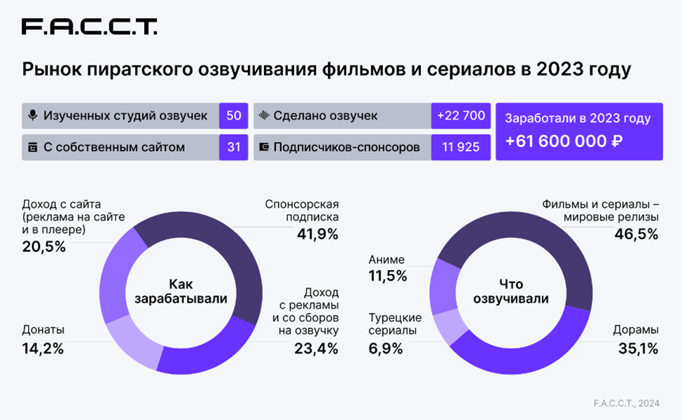 Компания F.A.C.C.T. изучила рынок и доходы за 2023 год неофициальных студий озвучки, чьи переводы используют в том числе нелегальные распространители видеоконтента. По данным экспертов, 50 крупнейших неофициальных студий, которые были активны на протяжении 2023 года, заработали в общей сложности 61,6 млн рублей. Это первое исследование такого рода, проведённое в России.