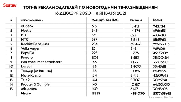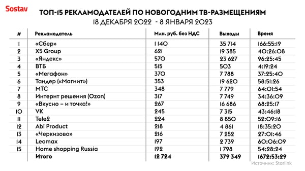 Уже третий год подряд топ возглавляет «Сбер» — затраты бренда на новогодние ТВ-кампании без учета НДС достигли 1,140 млн руб., что на 7% больше, чем в прошлом году. Компания нарастила и количество рекламных выходов — на 32%, а доля бренда от общего количества выходов Топа-15 составила 21%.