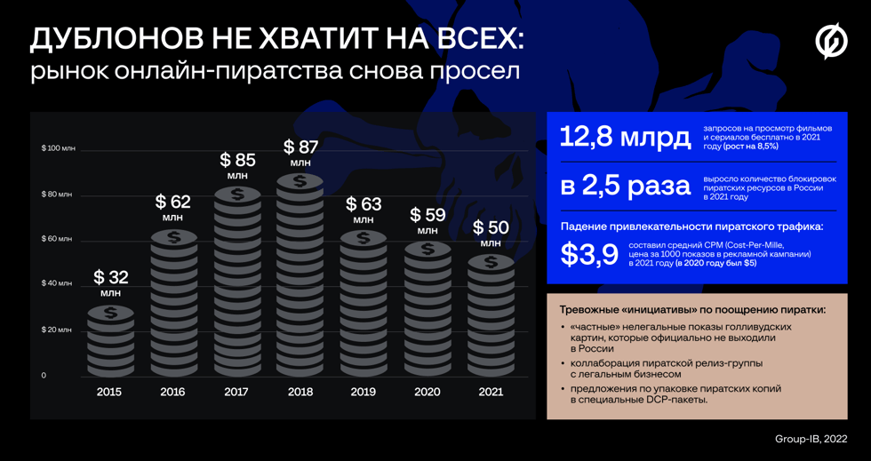Group-IB, один из мировых лидеров в сфере кибербезопасности, оценила нелегальный рынок интернет-пиратства в России в 2021 году в $50 млн — за год онлайн-флибустьеры обеднели еще на $9млн. Пираты лишились финансирования от своих главных спонсоров — онлайн-казино и гемблинга, а их инфраструктура пострадала от блокировок со стороны правообладателей.