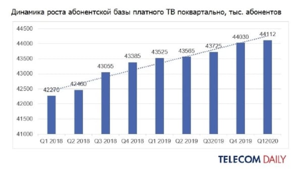 За первый квартал 2020 года количество абонентов платного ТВ увеличилось на 82 тыс. и достигло 44,112 млн домохозяйств, следует из нового исследования TelecomDaily. Рынок замедлил свой рост: за аналогичный период прошлого года абонентская база увеличилась на 140 тыс.