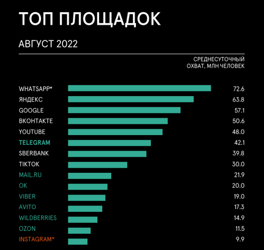 Начиная с марта 2022, россияне стали меньше времени проводить в социальных сетях. На это, в частности, повлияла блокировка *Instagram и Facebook (обе соцсети принадлежат Meta — признана экстремистской организацией и запрещена в РФ). Аудитория заблокированных ресурсов сильно сократилась и перераспределилась на другие социальные медиа: наибольший прирост аудитории показали Telegram и «ВКонтакте». Охват «Одноклассников» значимо не изменился, а вот аудитория TikTok несколько снизилась.