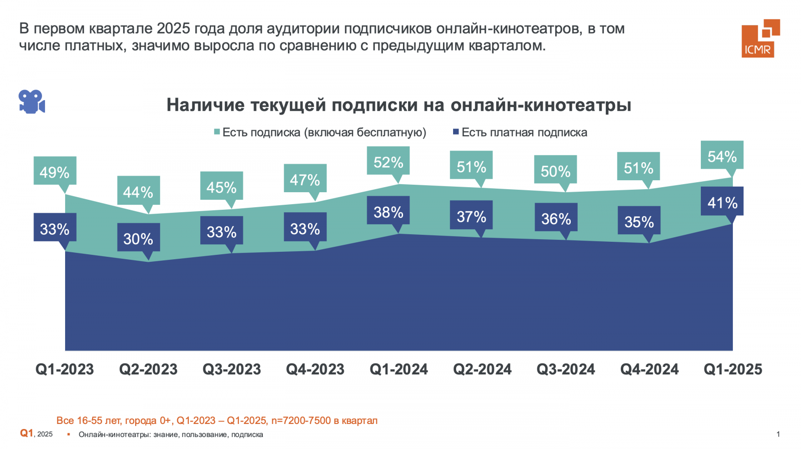 В первом квартале 2025 года подписками на онлайн-кинотеатры пользовался 41% жителей российских городов. Показатель впервые превысил 40%. Всего подписками, включая бесплатные и оформленные на пробный период, пользовались 54% городских жителей, что также стало рекордом наблюдений. Об этом Sostav рассказали в исследовательской компании GfK.
