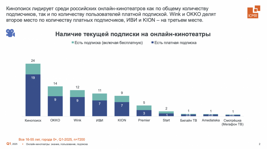 «Кинопоиск» продолжает занимать первое место среди онлайн-кинотеатров как по общему количеству подписчиков (24% горожан), так и по количеству пользователей с платной подпиской (19%).