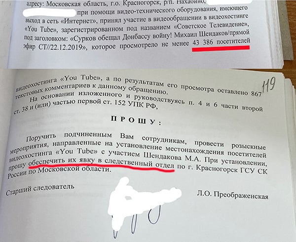 Согласно документам, которые оказались в распоряжении журналистов, старший следователь Преображенская Л. О. направила просьбу начальнику УМВД по Красногорску «обеспечить явку» в следственный отдел зрителей ролика Шендакова. В запросе указано, что ролик посмотрело более 43 тысяч посетителей YouTube, уточняет Securitylab.