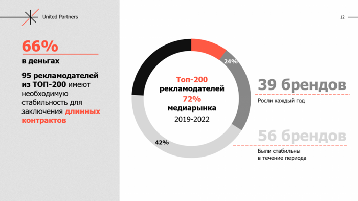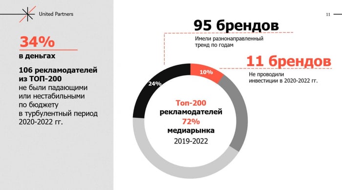 Кроме того, 39 брендов (24%) ежегодно наращивали свои инвестиции, а 56 брендов (42%) оставались стабильными. Суммарно 95 рекламодателей имеют необходимую стабильность для заключения долгосрочных контрактов.