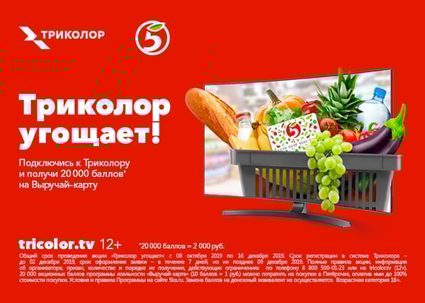 Триколор и торговая сеть «Пятёрочка» запускают совместную акцию «Триколор угощает!», в рамках которой новые клиенты оператора могут получить 20 000 баллов на карту программы лояльности «Выручай-карта».