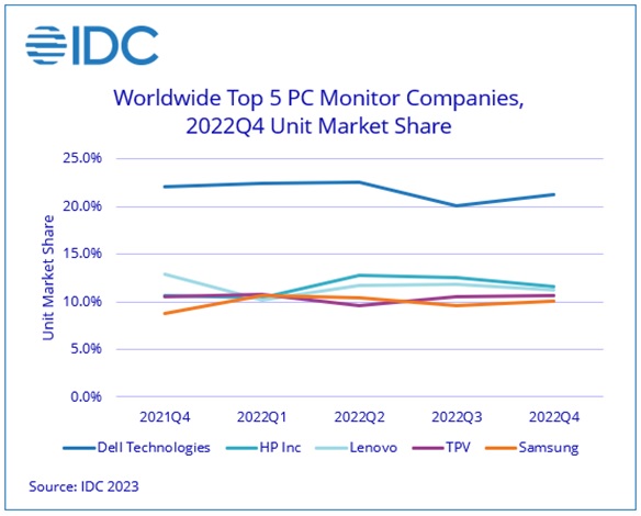 Тесно связанный с рынком ПК рынок компьютерных мониторов также сократился в последнем квартале прошлого года на 18.3% в годовом выражении, что привело к падению объема рынка в штуках за полный 2022 г. на 5.9%.