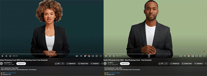 В роликах искусственно сгенерированный аватар роботизированным голосом рассказывает, как взломать популярный софт. Например, Photoshop, Premiere Pro, Autodesk 3ds Max, AutoCAD и других продукты. В описании к «видеоуроку» киберпреступники оставляют ссылку, ведущую на скачивание вредоносного программного обеспечения. В основном это инфостилеры, такие как Raccoon, RedLine и Vidar.
