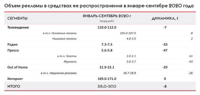 За три квартала 2020 года объем рекламного рынка в России сократился на 8%